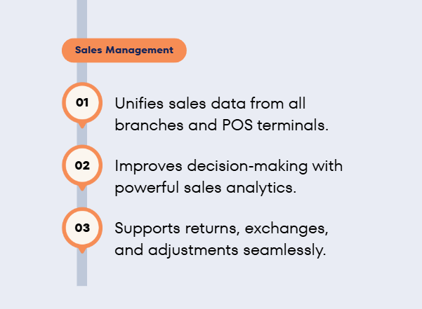 All sales—from POS transactions to branch-level invoices—are centrally recorded and analyzed. Businesses gain access to detailed reporting and analytics that reveal sales performance, peak hours, top-selling products, and branch-wise revenue. This module empowers managers to identify trends, improve pricing strategies, strengthen promotional campaigns, and make more informed business decisions.