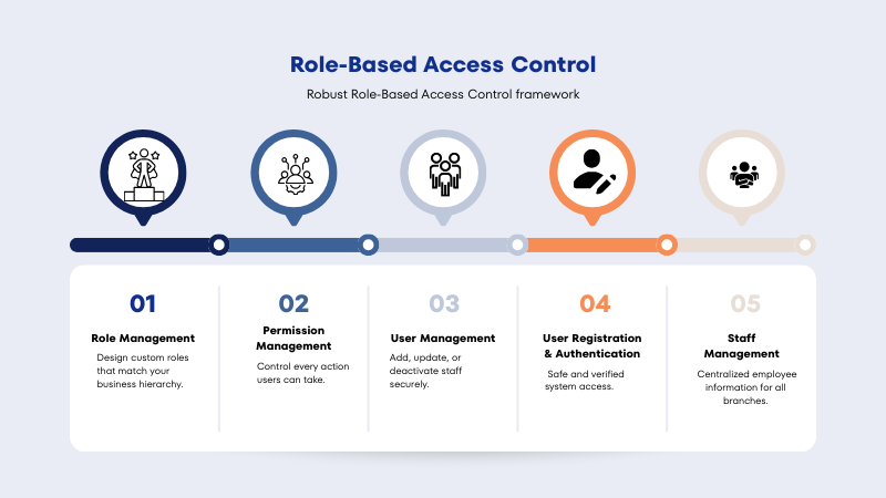 The system is built around a robust Role-Based Access Control framework that protects your business data and ensures operational discipline. With customizable roles and permissions, you can define exactly what each staff member can access or perform within the system. User registration and authentication verify identities and prevent unauthorized access, while centralized staff management allows you to track employee activity, assign responsibilities, and maintain high accountability across the organization. This ensures that every team member works within their designated scope, reducing errors and safeguarding sensitive information.